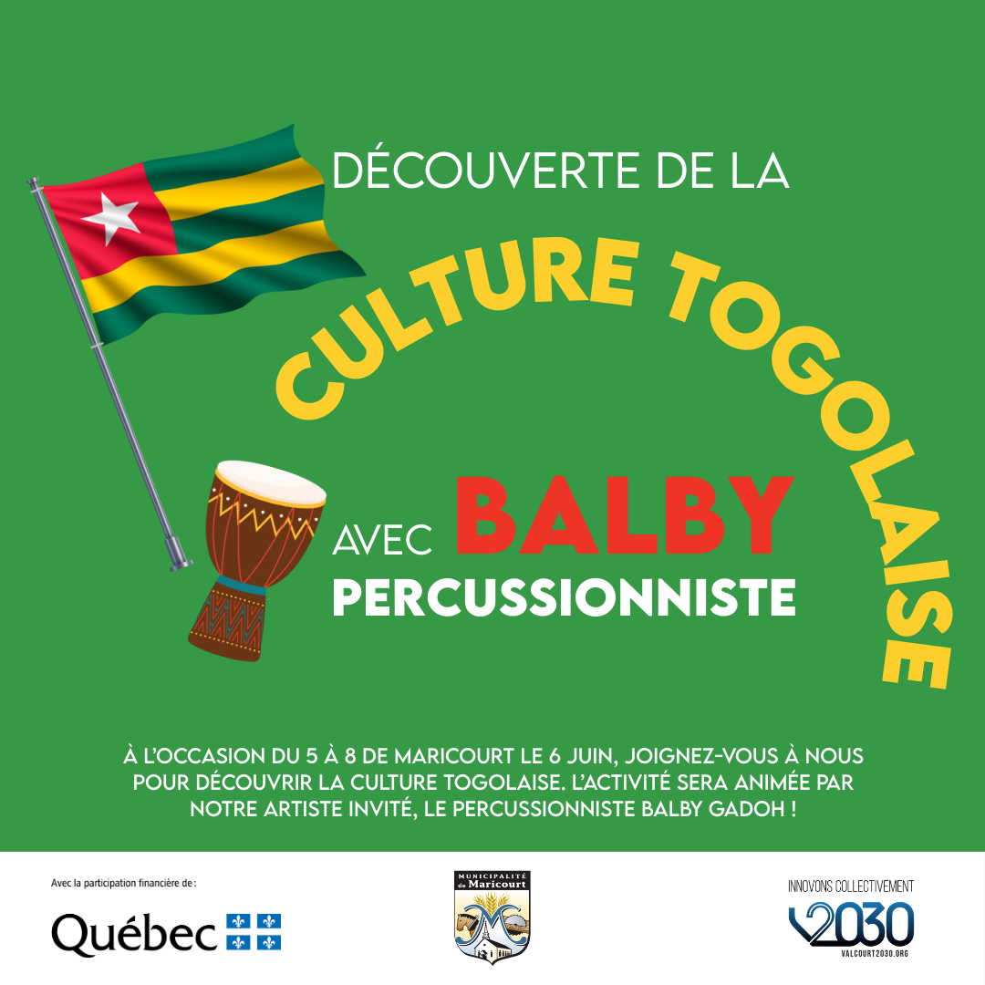 À l’occasion du 5 à 8 de Maricourt LE 6 JUIN, au centre communautaire, joignez-vous à nous pour découvrir la culture TOGOLAISE. L’activité sera animée par notre artiste invité, le percussionniste Balby Gadoh !